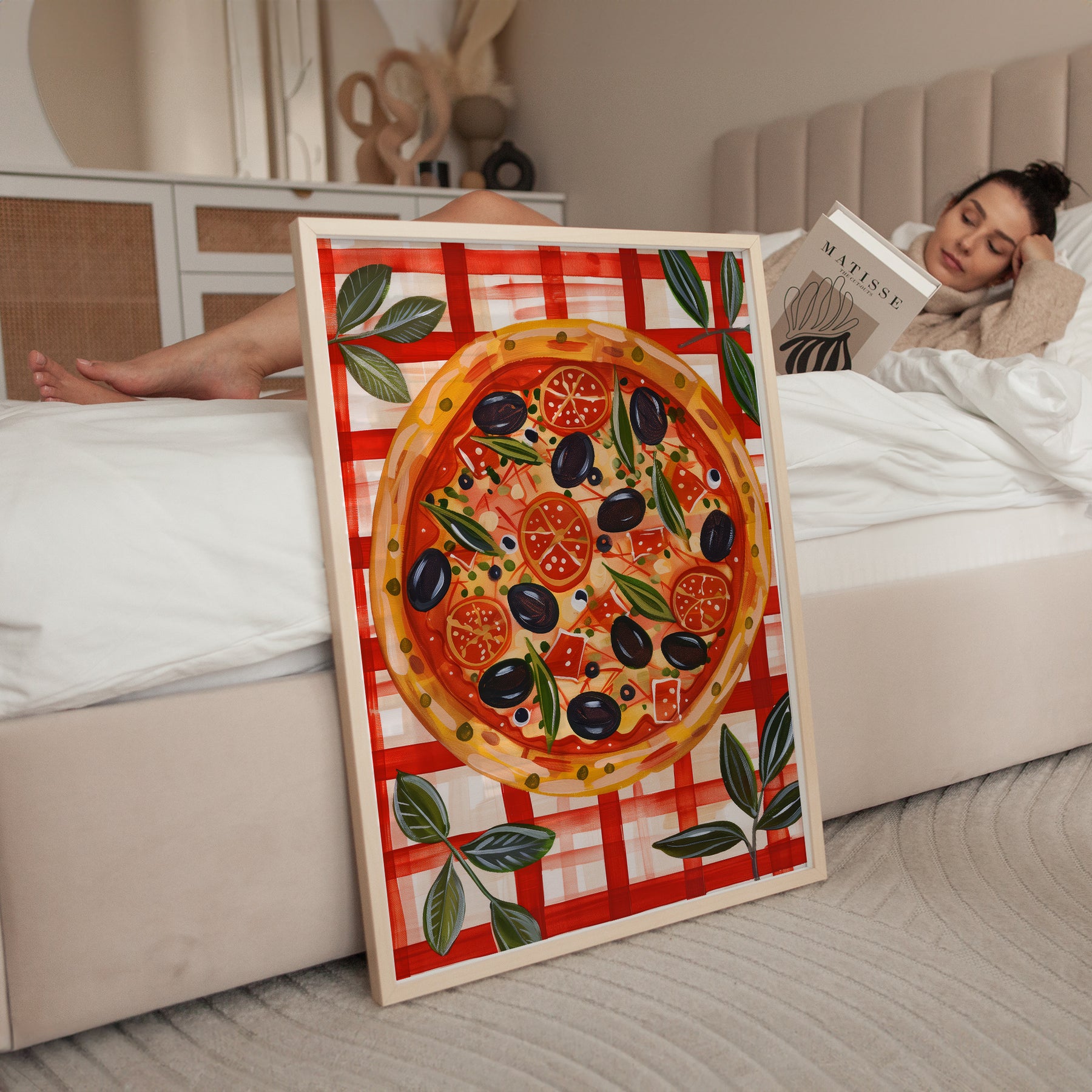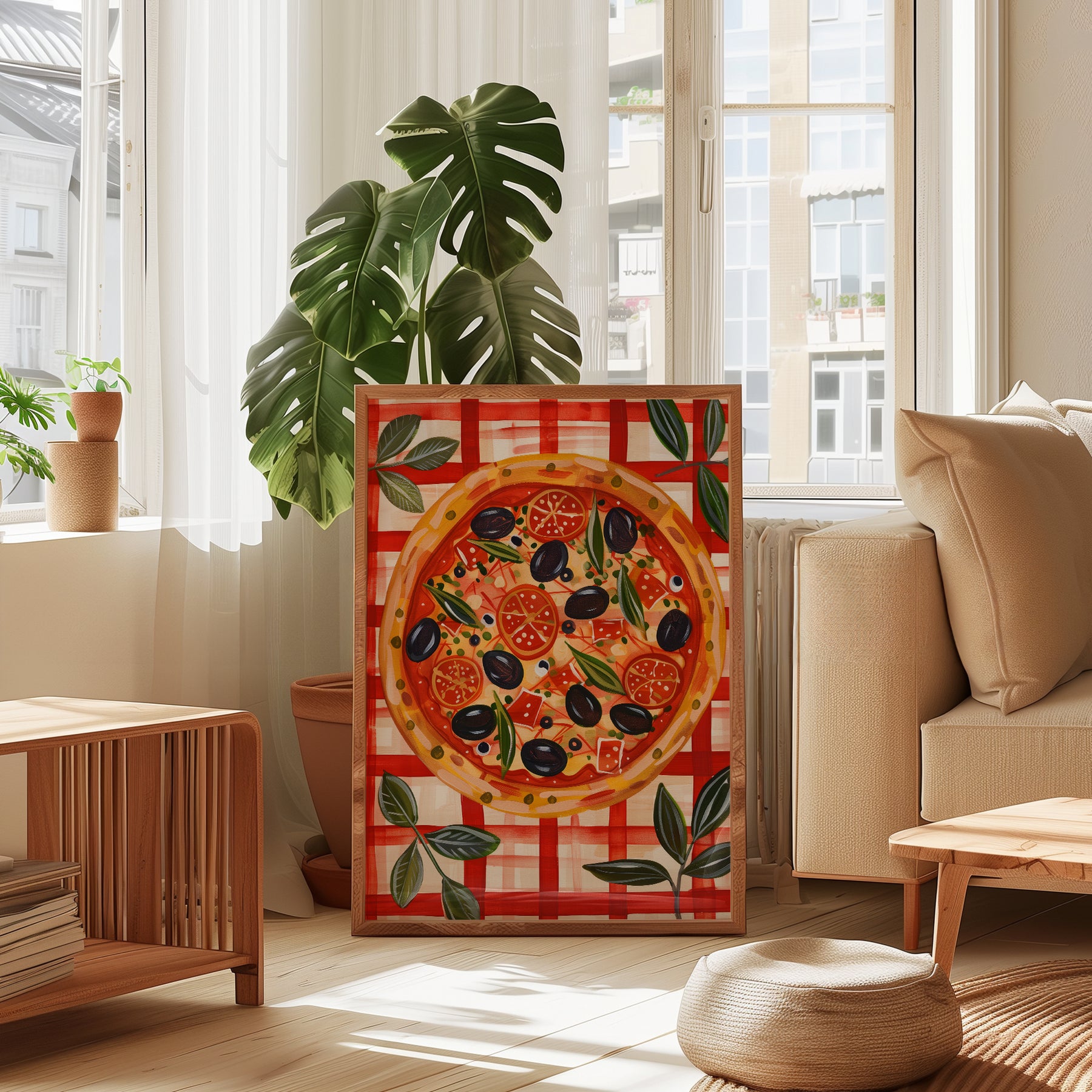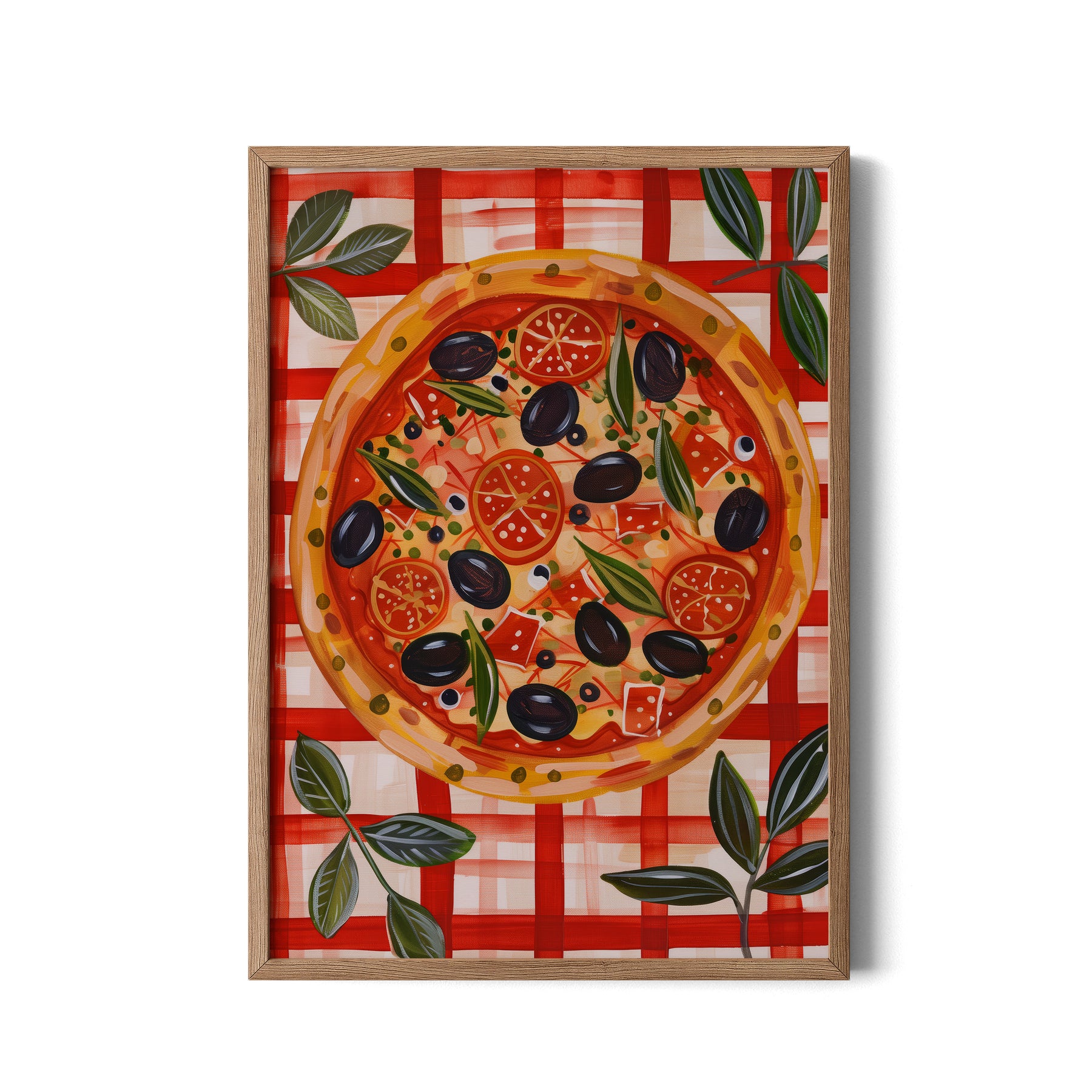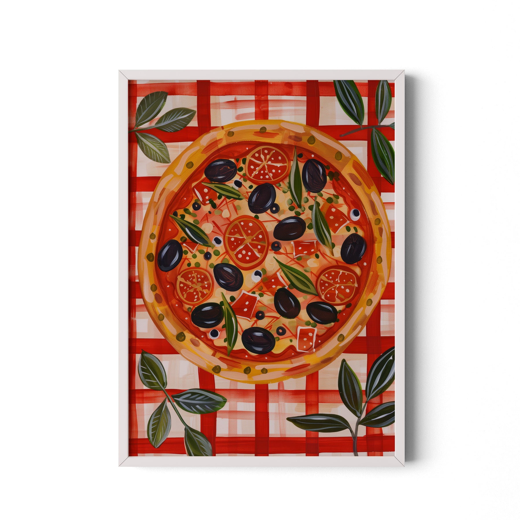 "A Slice of Italy" is a delightful and decorative piece that elevates the humble pizza to an art form. The artwork features strong compositional elements, with the circular pizza contrasting beautifully with the grid of the tablecloth. The stylized olive branches add a touch of natural elegance, enhancing the overall Mediterranean feel. This print is not only visually appealing but also evokes a feeling of happiness, perfect for creating an inviting and spirited atmosphere.