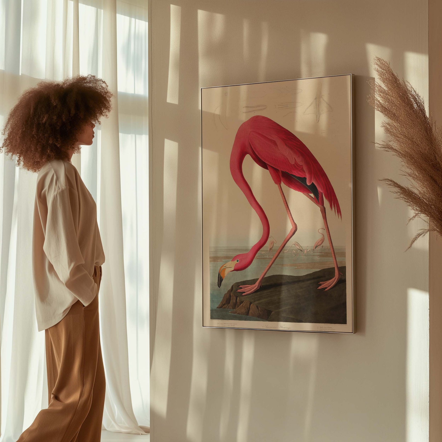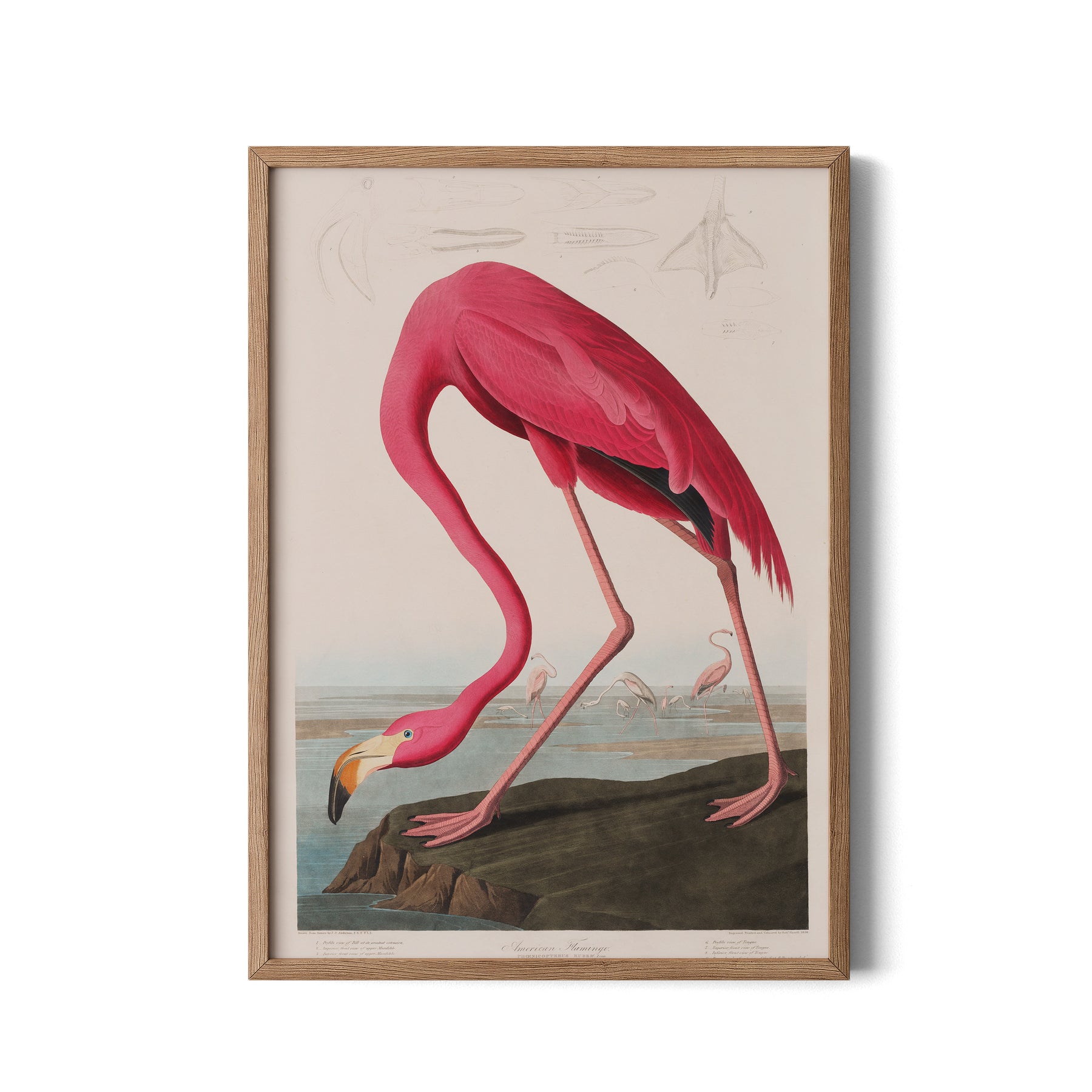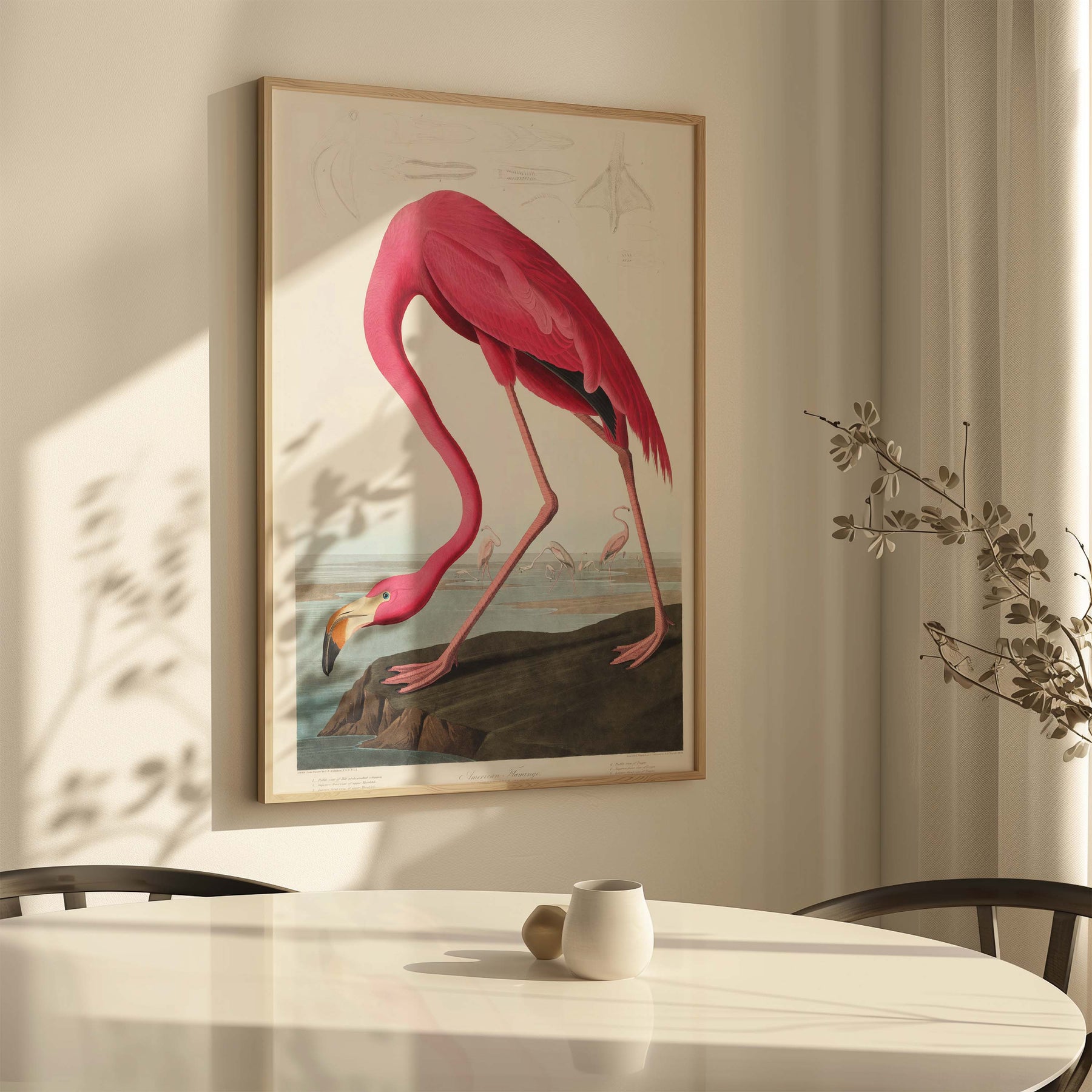 Significance: It's one of the 435 plates from the monumental work "The Birds of America." This series is celebrated for its lifelike, life-size depictions of birds in their natural habitats, a revolutionary concept at the time. The flamingo itself is a dramatic and iconic image from the collection, with its neck bent to fit the large paper.