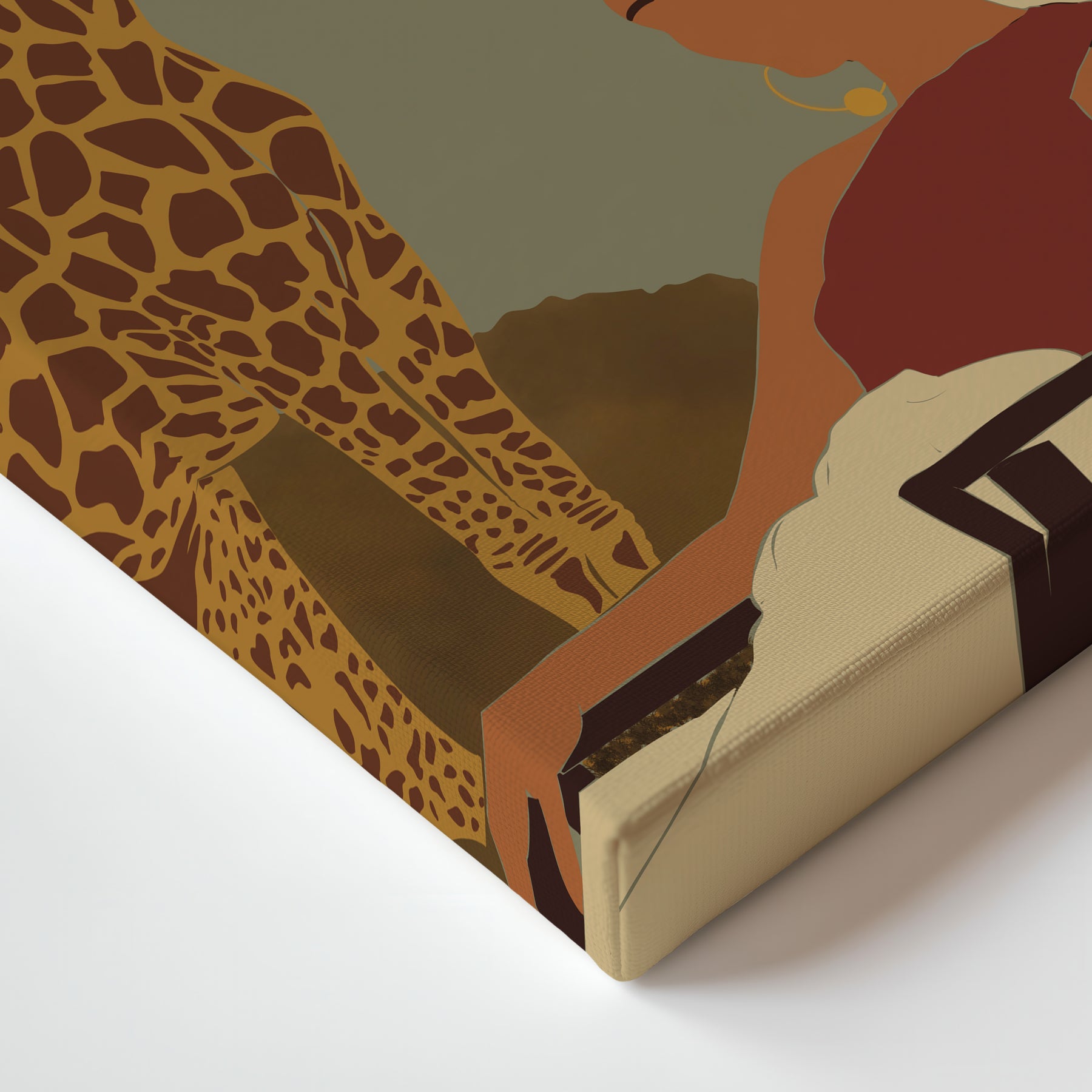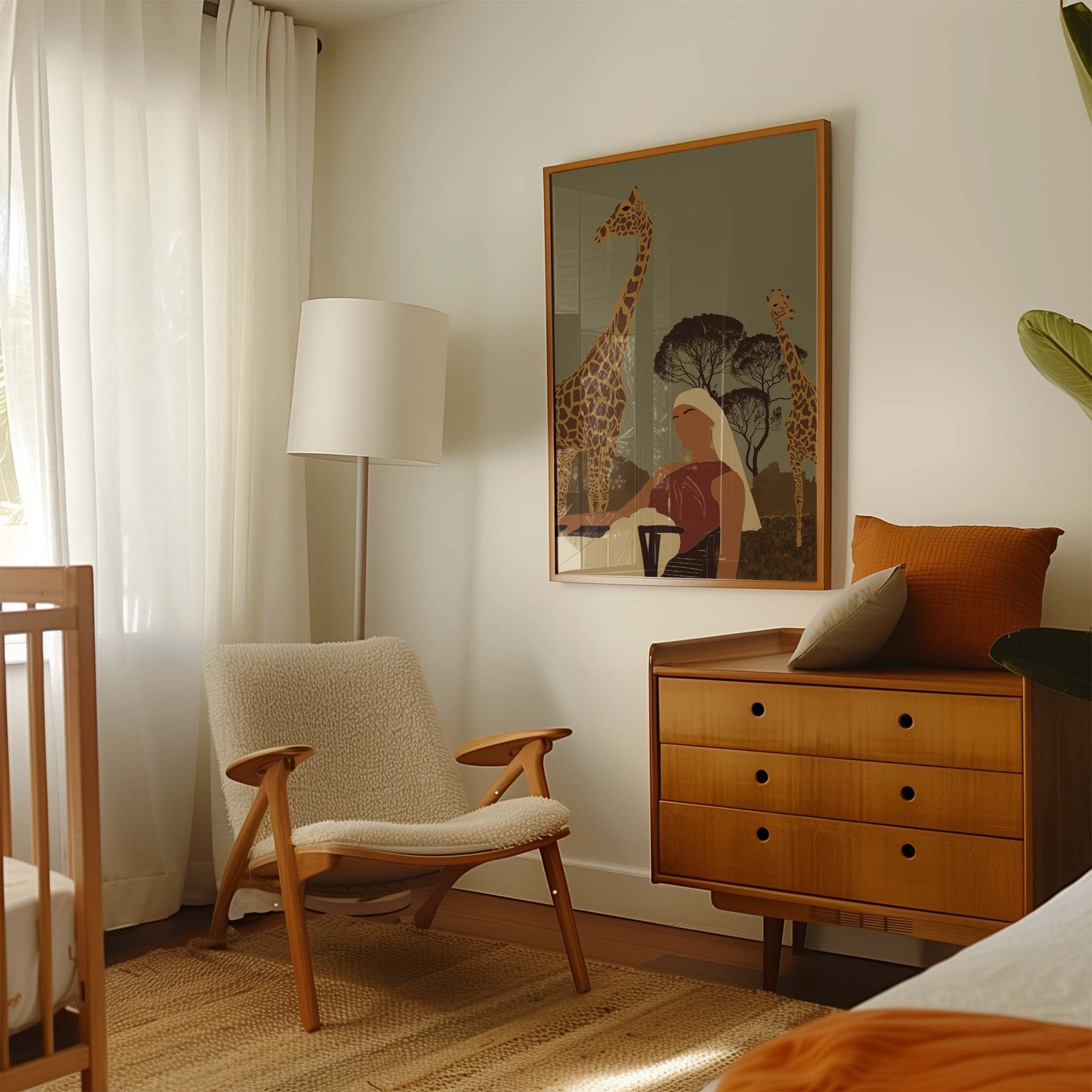 Immerse yourself in the tranquility of the African savanna with this captivating abstract art print. "Safari Serenity" portrays a graceful woman observing giraffes in their natural habitat, evoking a sense of calm and connection with the wild. The warm, earthy tones and minimalist style make it a sophisticated addition to any space, perfect for bringing a touch of exotic elegance and peaceful reflection to your living room, bedroom, or office.