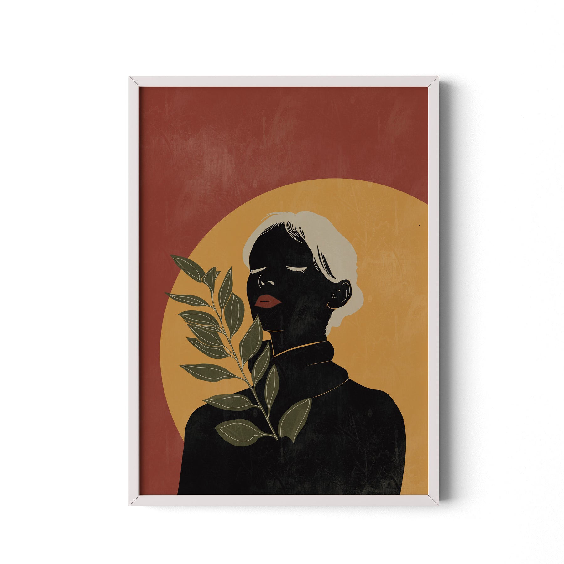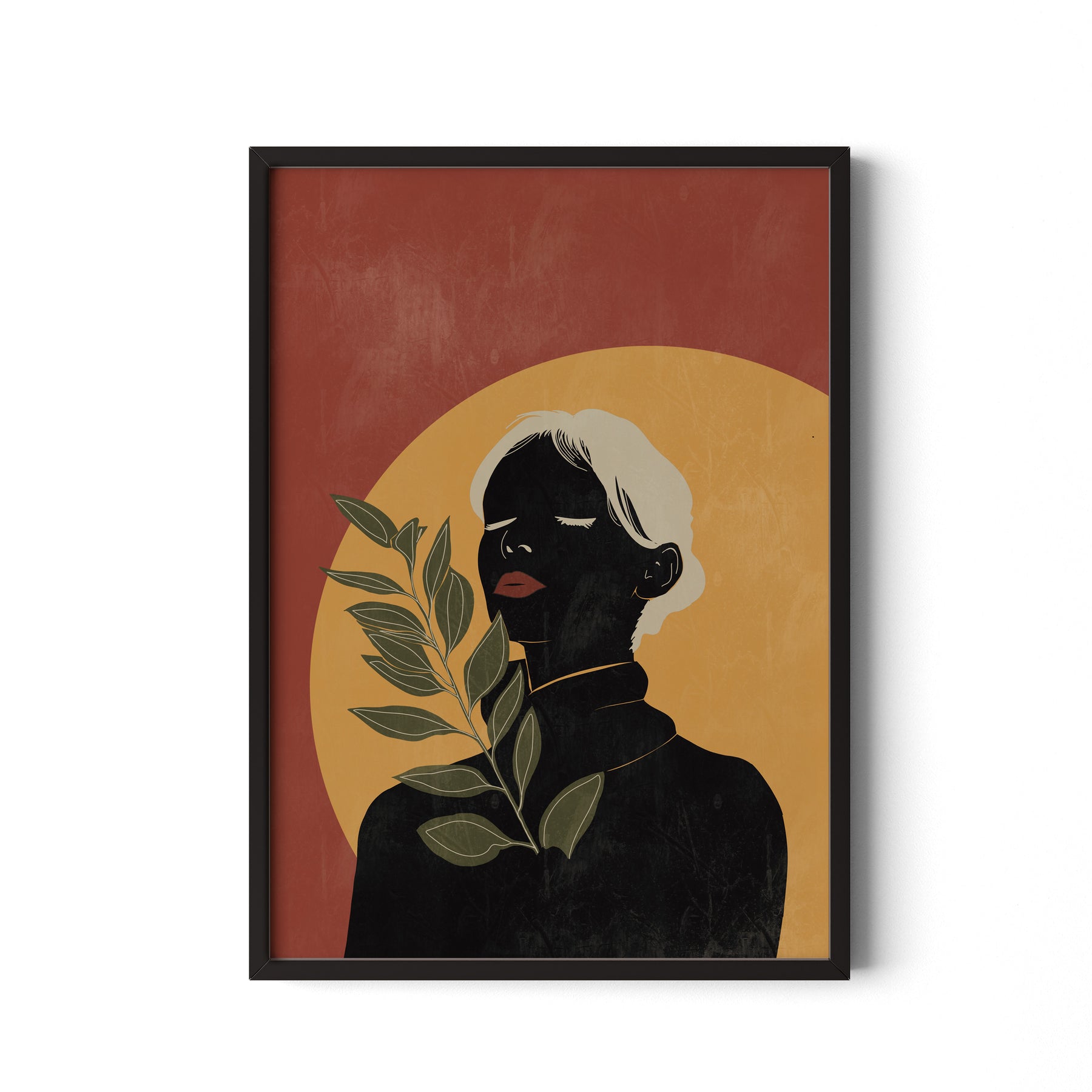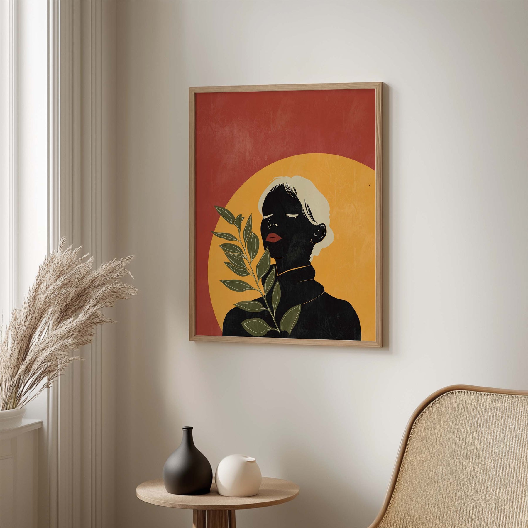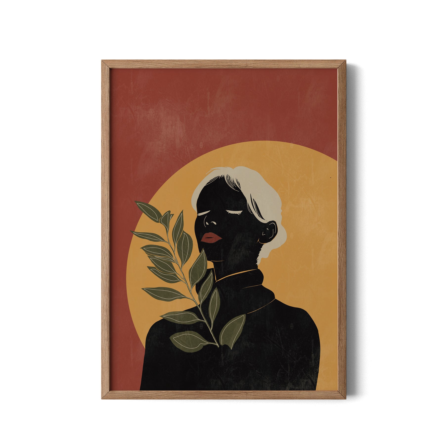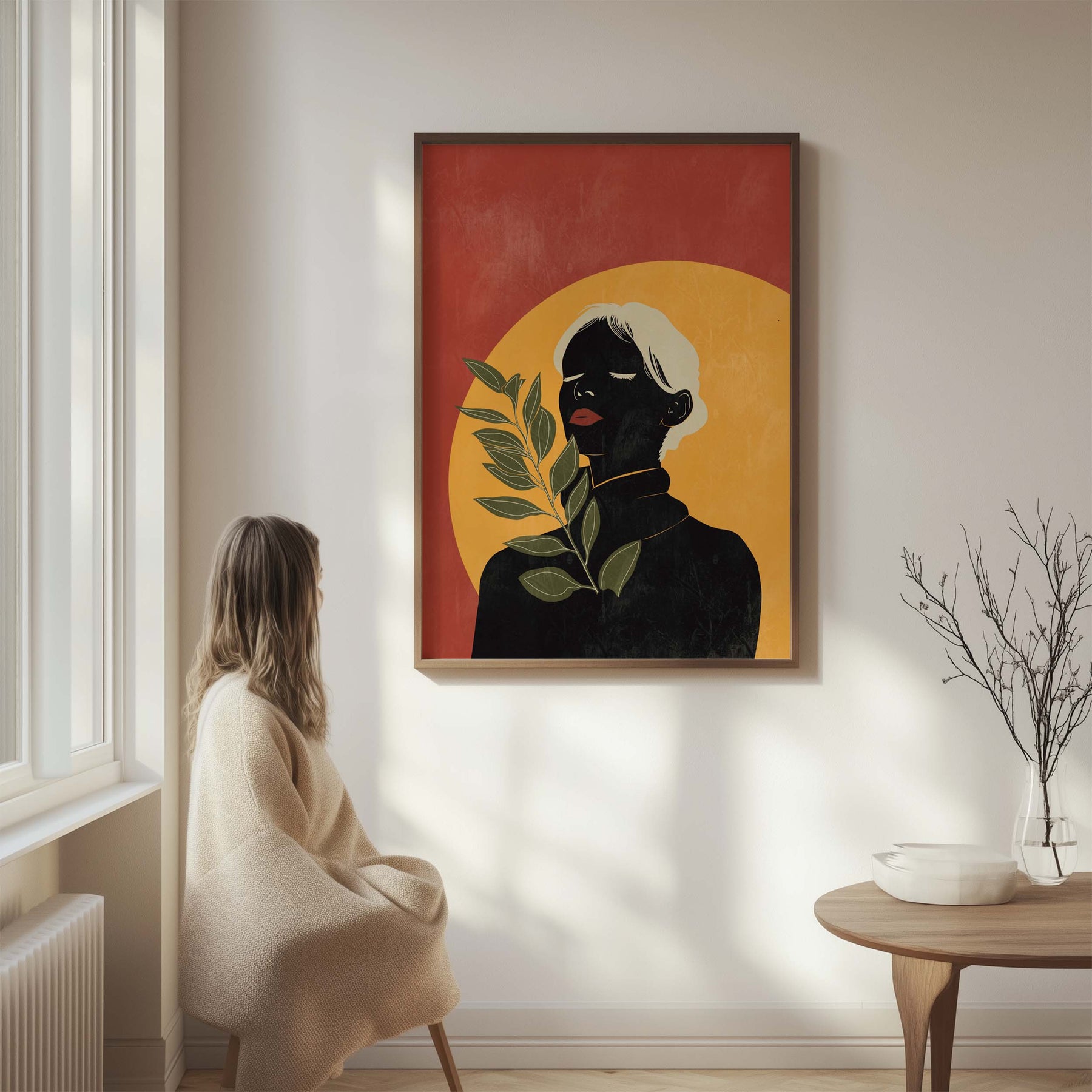 Discover tranquility with this serene abstract portrait, Inner Bloom. Featuring a woman with closed eyes in quiet contemplation, holding a delicate olive branch, this artwork beautifully blends rich earth tones with a minimalist aesthetic. The warm red and golden sun backdrop creates a soothing atmosphere, making it a perfect piece to bring calm and grounding energy to your living room, meditation space, or bedroom.