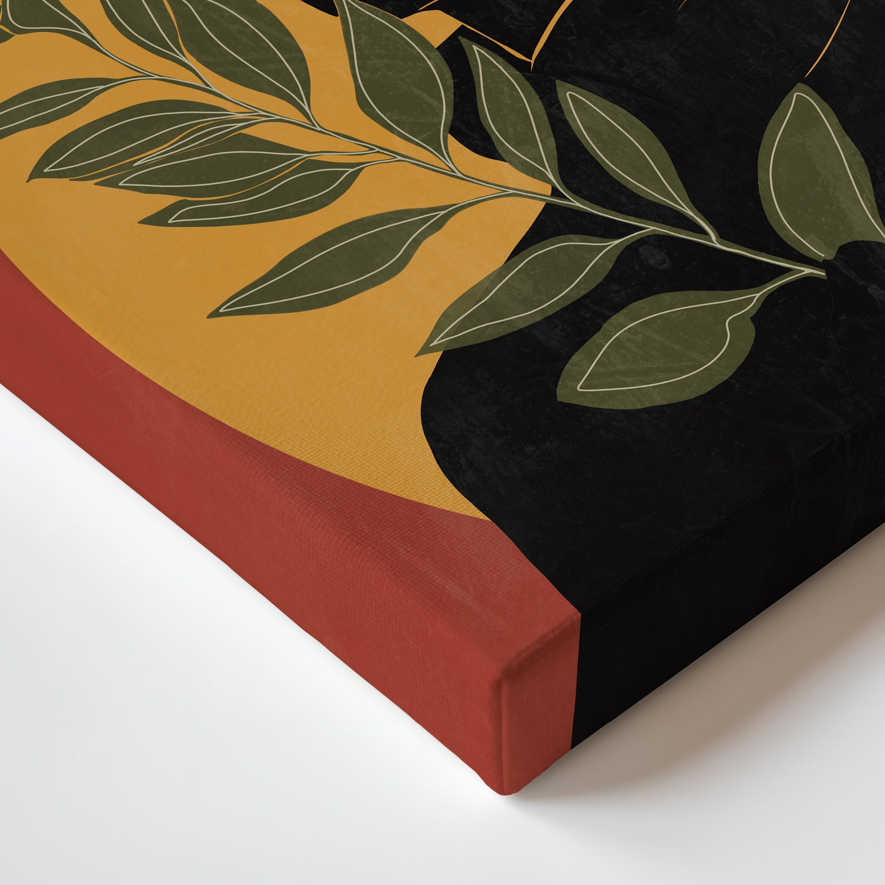 This artwork is a profound exploration of introspection and connection to nature. The woman's closed eyes and the prominent olive branch symbolize peace, contemplation, and renewal. The striking use of a rich, textured black for her silhouette against a warm, sun-like circle and a deep red background creates a powerful visual contrast. This minimalist style, combined with a palette inspired by natural elements, invites viewers to pause and reflect on their inner world and their place within it. It's a modern piece with timeless symbolic depth.