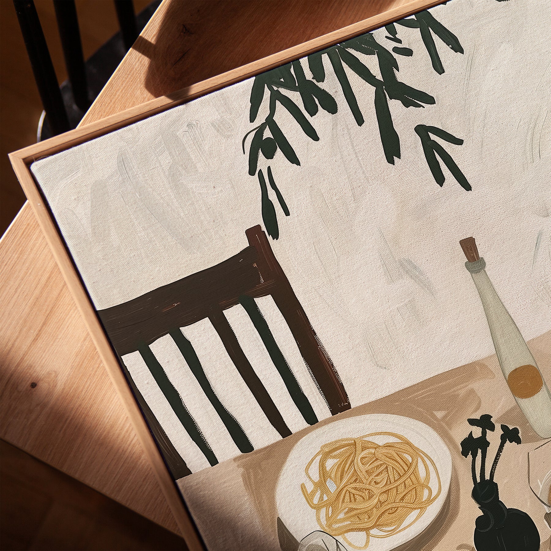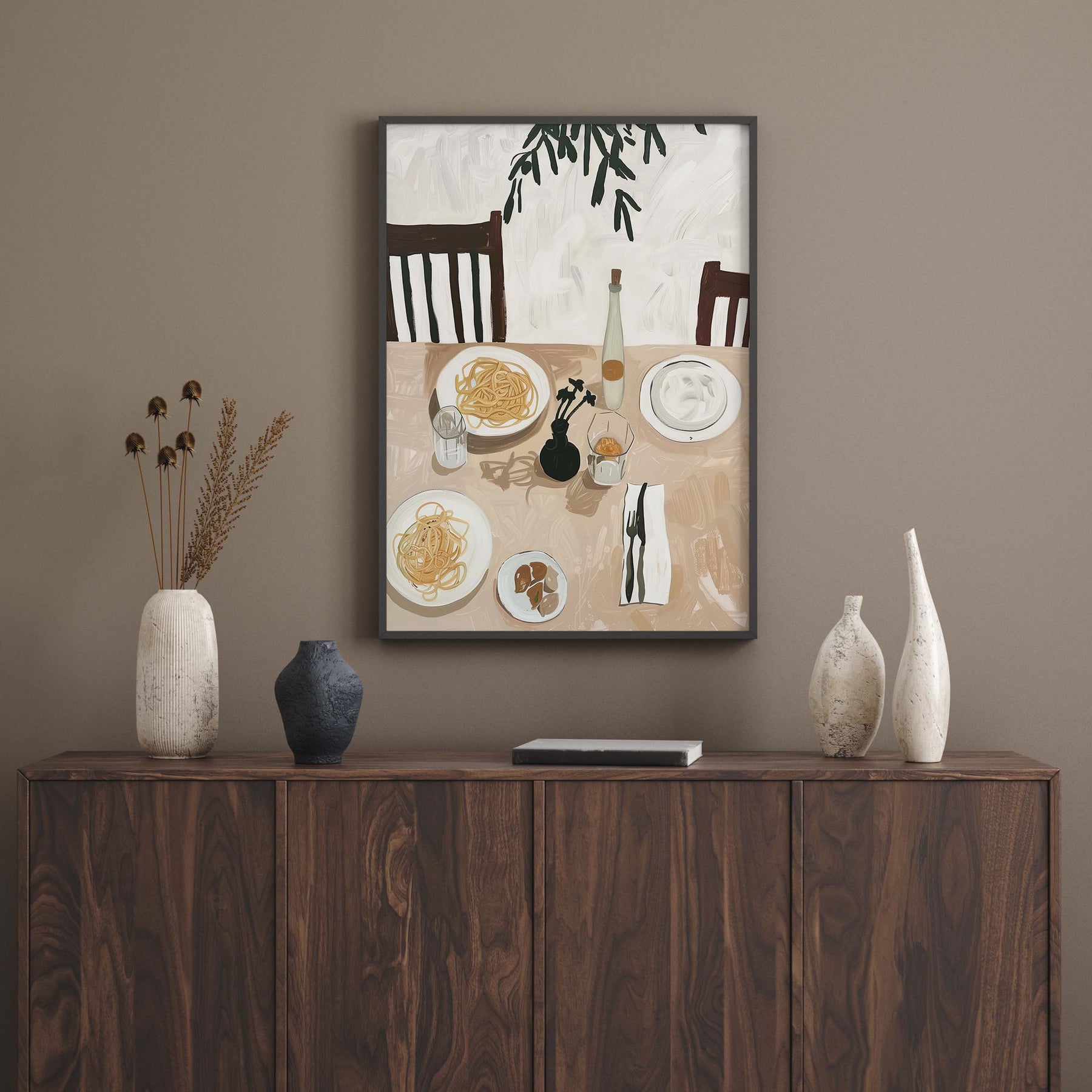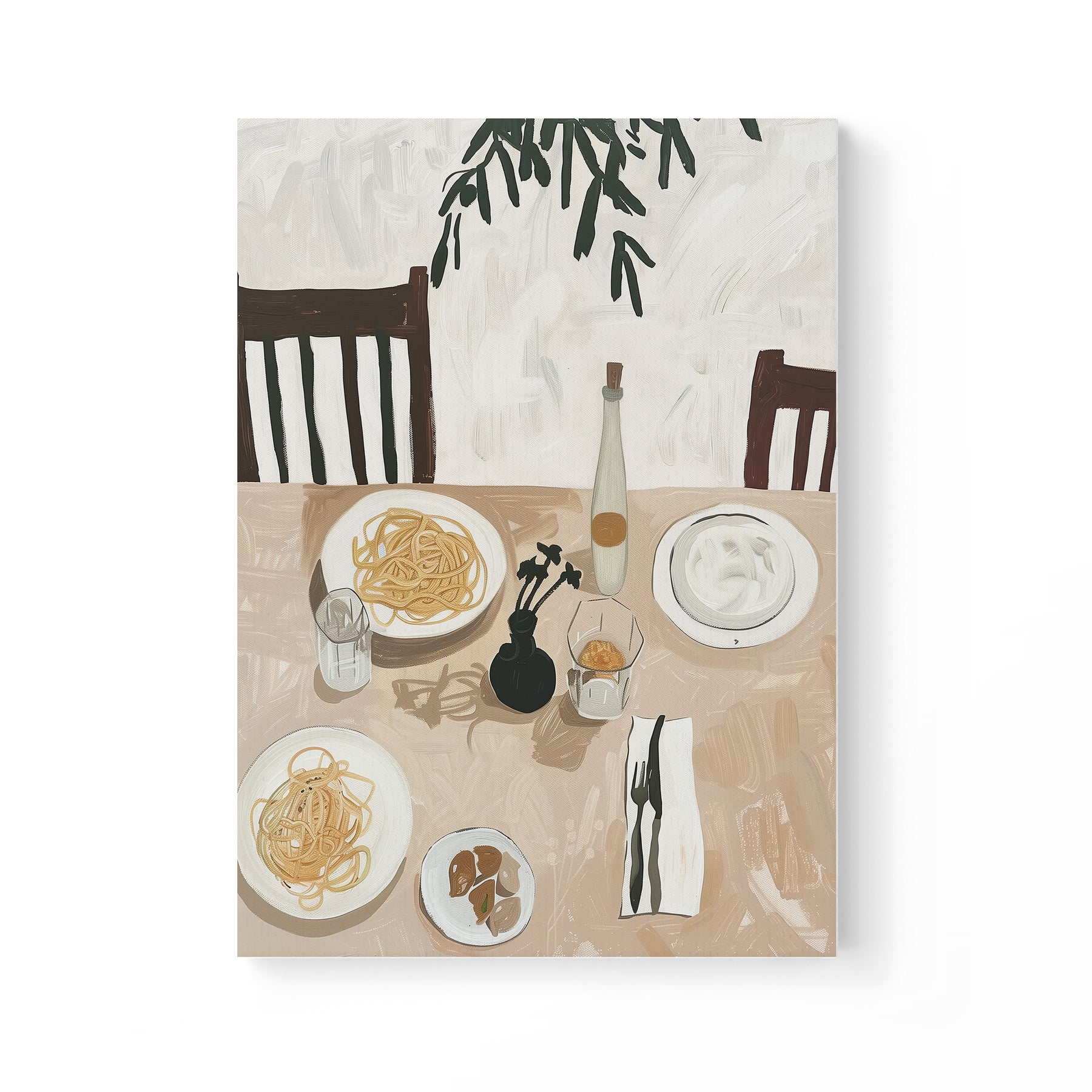 This charming and intimate art print, "Pasta for Two," captures a moment of quiet connection and simple pleasure. The minimalist composition features two plates of spaghetti, a bottle, and a set of chairs, all rendered in a warm, textured Impressionistic style. The soft, earthy color palette and gentle brushstrokes create a sense of calm and rustic elegance, making it a perfect piece for a dining area, kitchen, or a cozy living space.