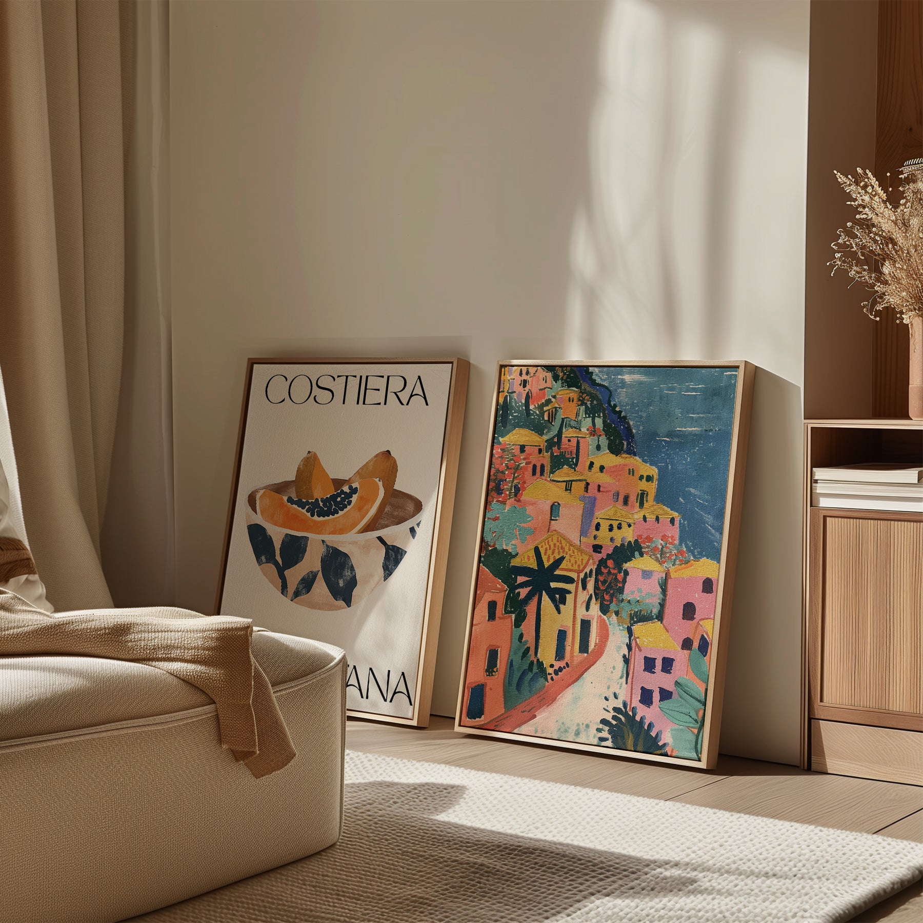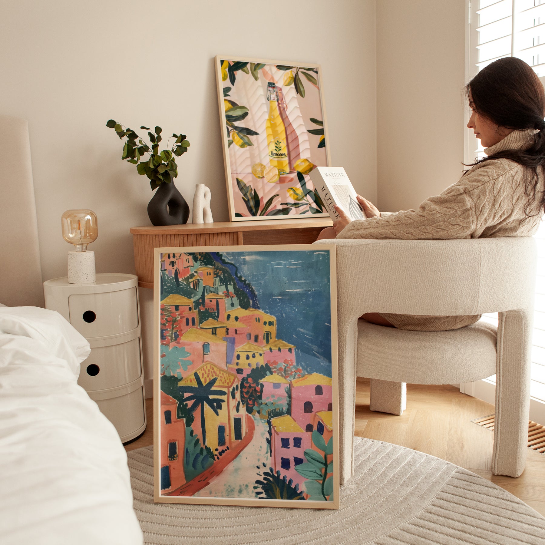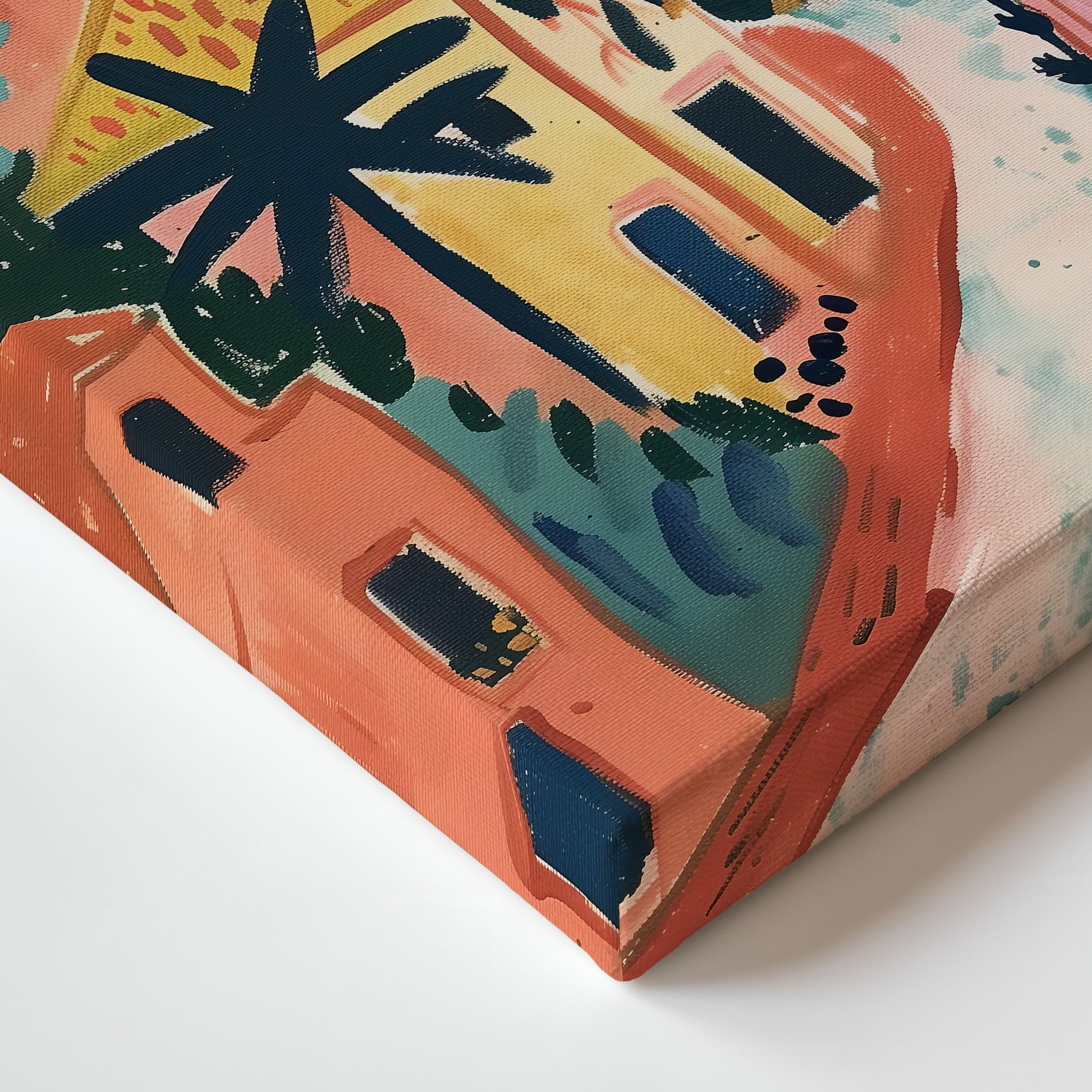 Transport yourself to the sun-drenched cliffs of the Mediterranean with this captivating coastal village painting. Its vibrant palette of terracotta oranges, warm yellows, and lush blues captures the quintessential charm of a European seaside town, reminiscent of iconic destinations like Positano or Cinque Terre. The expressive brushstrokes and stylized forms evoke a sense of warmth, relaxation, and the gentle bustle of a holiday. This piece is perfect for adding a pop of color and a touch of travel-inspired decor to any living room, bedroom, or office, inviting a perpetual summer into your space.